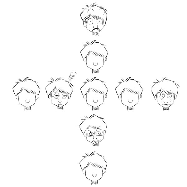 La suite d’expression doit bien sur être logique et cohérente. Entraîne-toi à passer progressivement d’une émotion à l’autre : par exemple, ton personnage peut passer d’une expression dubitative (2) à l’étonnement (3) puis à une franche surprise(4) !