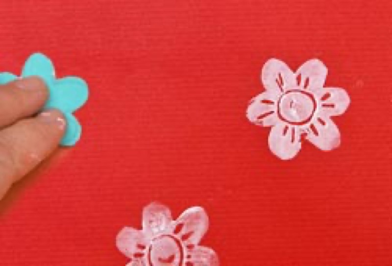 Prenez votre tampon fleur et de la peinture acrylique blanche. A l’aide d’un pinceau badigeonnez une fine couche sur votre tampon puis appliquez le tampon sur le papier kraft et recommencez l’opération autant de fois que vous le souhaitez.
