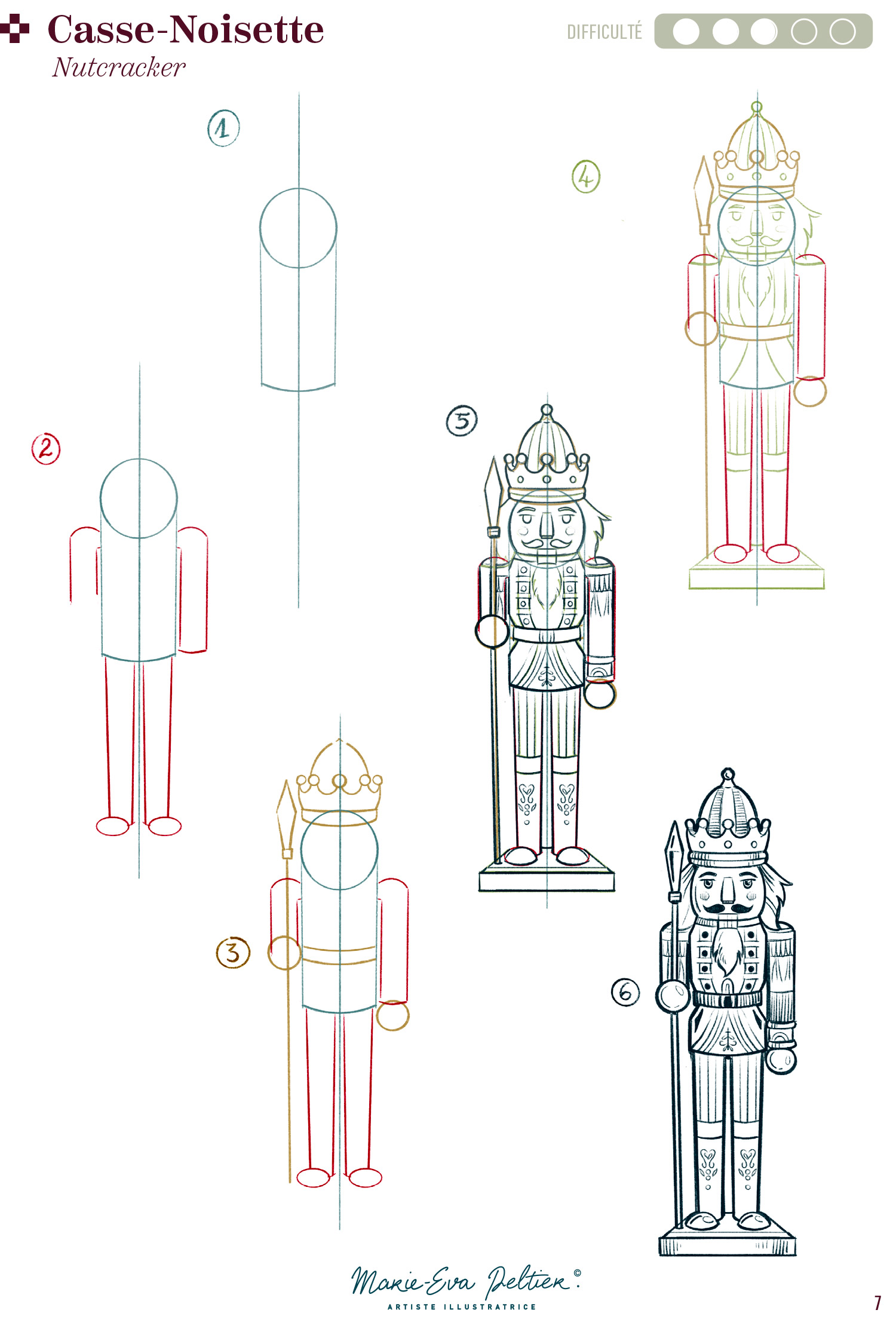 Aujourd’hui, le casse-noisette est devenu une véritable icône graphique. Le dessiner, c’est renouer avec une tradition ancienne tout en s’appropriant ses codes visuels. C’est aussi l’occasion de travailler la symétrie, les proportions et le détail, avec un soupçon de nostalgie et beaucoup de plaisir. Et rassurez-vous, celui-ci ne cassera que des crayons.