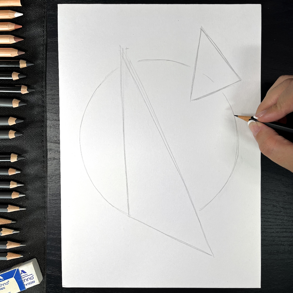 Observez et respectez les différentes directions. À partir de formes géométriques simples, l'idée est de tracer les guides qui vont nous assurer une bonne construction.