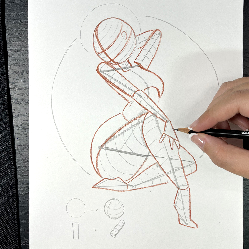Avant de rentrer dans les détails et l'habillage, on va venir tracer les volumes par-dessus notre squelette. Les formes 2D vont s'articuler et être pensées en 3D : le rond de la tête devient une sphère, avec l'orientation du visage symbolisé par un plus.