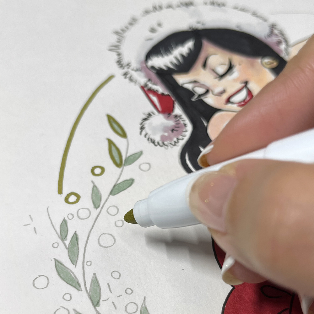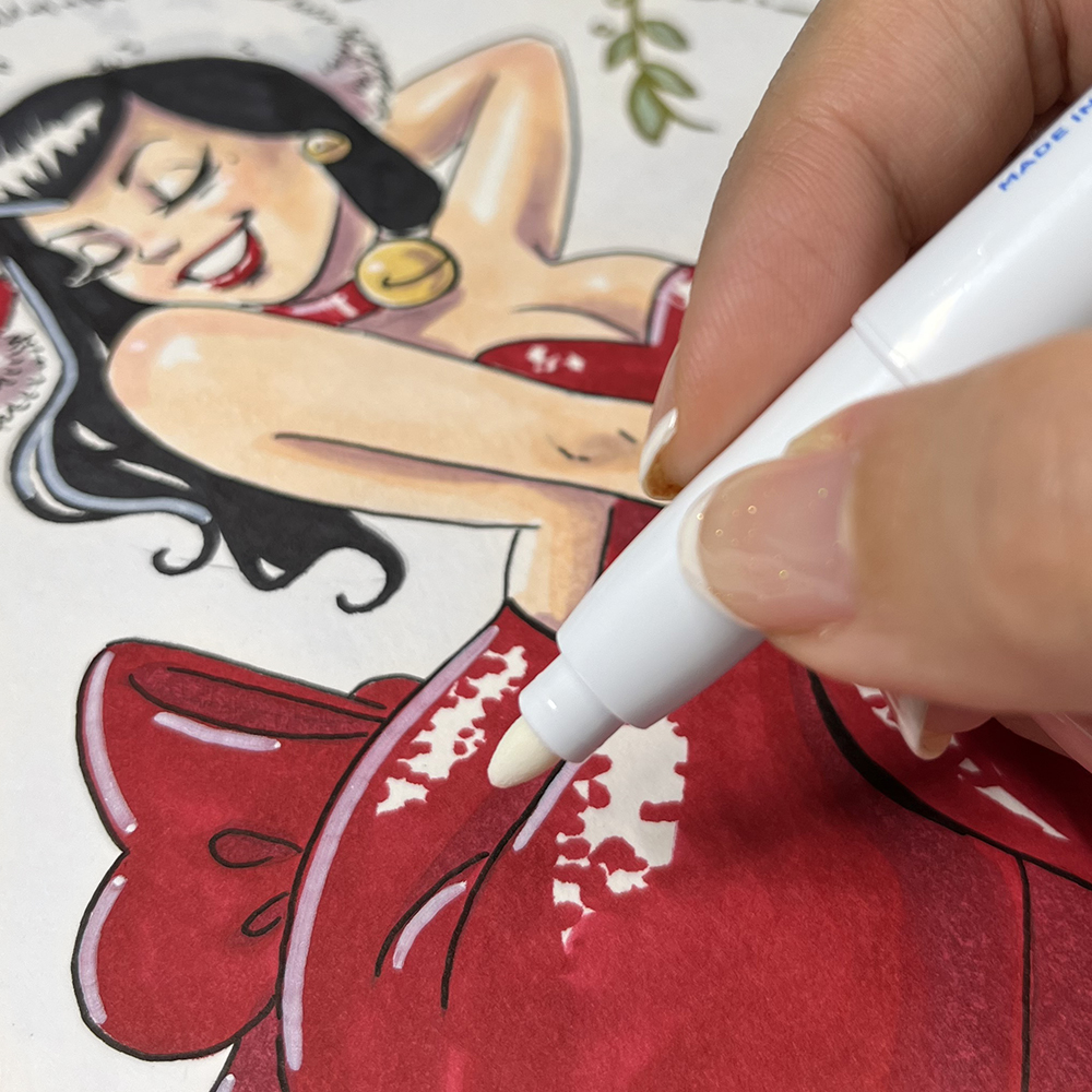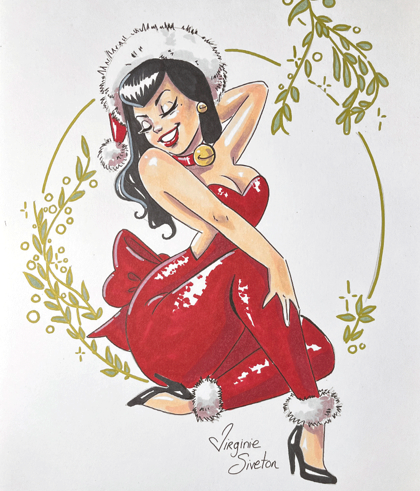 Vous pouvez entourer cette pin-up de Noël avec des petites feuilles vertes lors de la mise en couleur. Ces feuilles vont permettre de guider le regard du spectateur autour du personnage. Pour cette dernière touche, vous pouvez jouer sur un encrage doré pour détacher le personnage du fond.