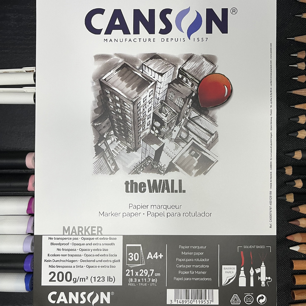 Vous pouvez travailler avec le bloc Canson® The Wall en utilisant un crayon sec pour esquisser la composition avec légèreté. Sans appuyer, placez les formes simplifiées, en cherchant l'équilibre et la place que le dessin va prendre sur le papier.