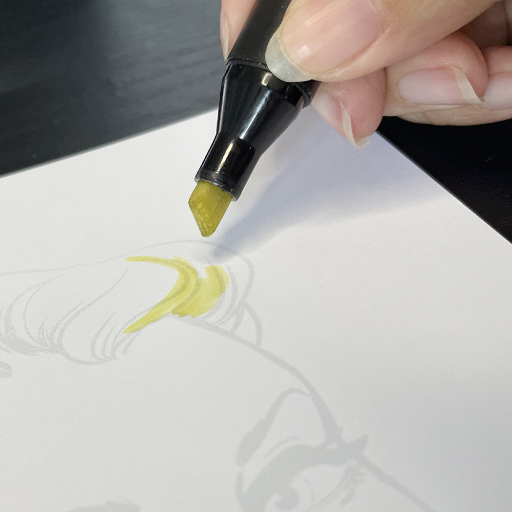 Conseil : Vous pouvez faire une photocopie de votre dessin pour vous permettre de garder votre dessin sur lequel vous avez passé du temps et faire des tests de couleur. Autre possibilité : c'est de mettre au propre votre dessin à l'aide de papier calque ou d'une table lumineuse, ainsi vous ne gardez que les lignes épurées de votre illustration et votre papier n'a pas été abîmé par le gommage.