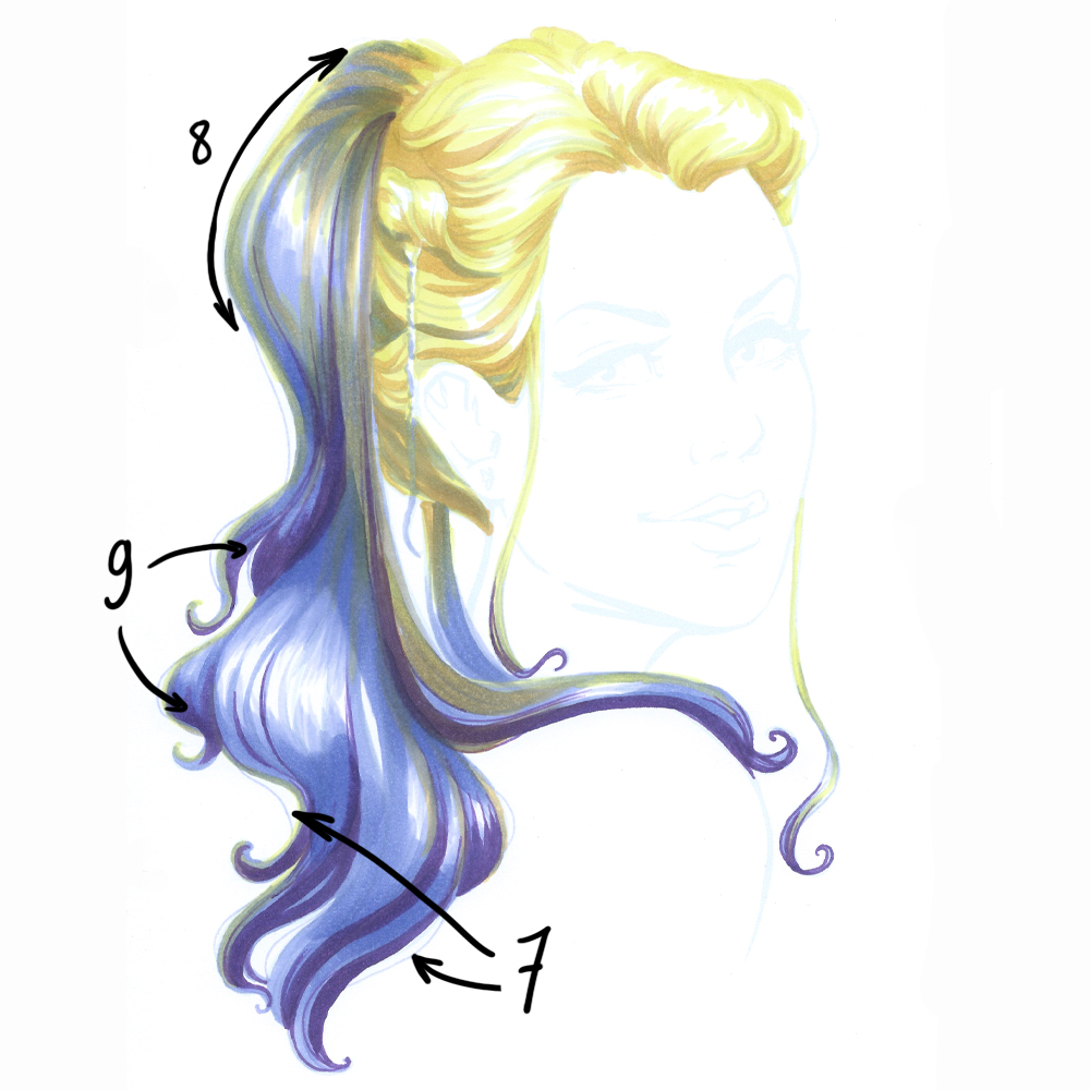 Une fois la structure en place, on peut ajouter la coiffure en veillant à travailler en volume. Cette étape permet d'anticiper la réflexion et de comprendre comment les mettre en couleur. Les cheveux ne sont pas collés sur notre tête. Gardez à l'esprit qu'il y a de l'espace entre les mèches et les couches de cheveux qui s'accumulent pour créer du volume. Pour plus de cohérence, il faut être vigilant sur le poids des accessoires de la chevelure ou aux attaches qui la constituent. Il faut tenir compte du type de cheveux et de son volume : raides, bouclés, frisés...