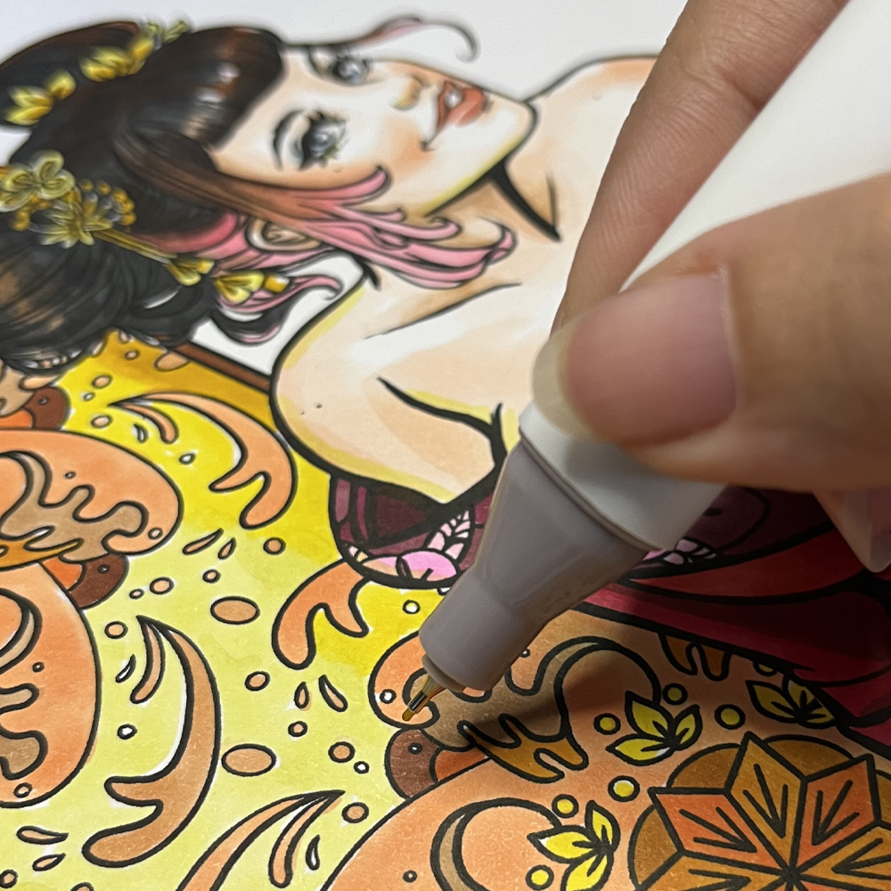 Le truc en plus : Les feutres à alcool sont compatibles avec le crayon de couleur, trame, acrylique, ce qui permet d'affiner encore plus les détails.