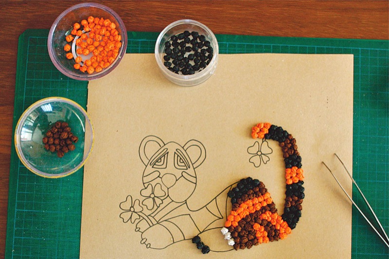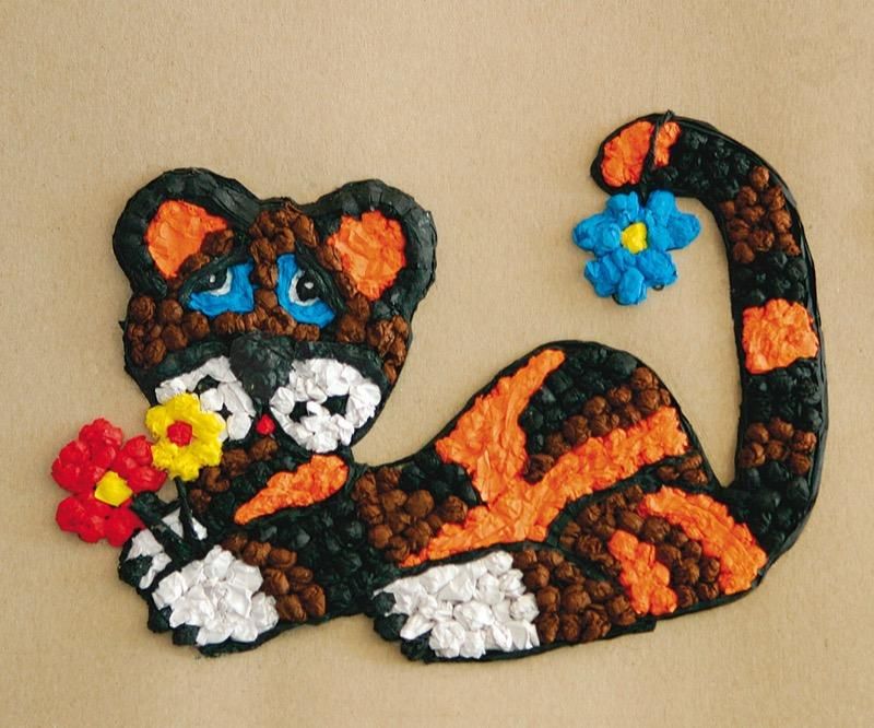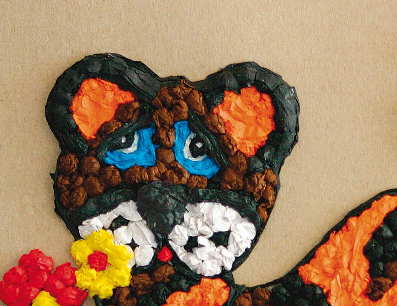 Que diriez-vous d’accrocher sur le mur de votre chambre ce mignon tigreau réalisé en petites boules de papiers de soie colorés ?