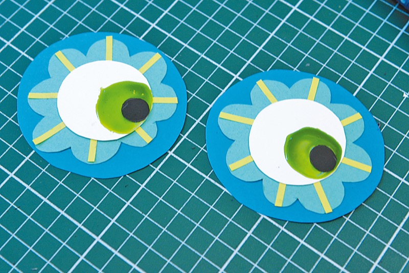 Pour le reste des yeux, choisissez des couleurs différentes. Découpez le motif de la fleur sur une feuille colorée et des bandes minces dans un autre ton que vous collerez ensuite au bord des yeux.