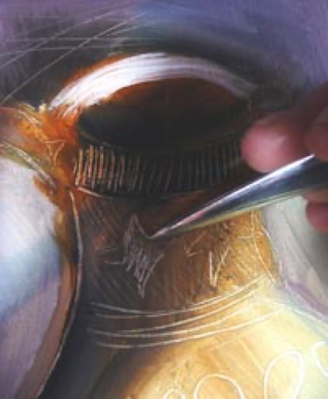 L’aspect des lignes et motifs gravés dépend de l’épaisseur de la peinture, de son degré de séchage (humide ou sèche) et de l’instrument utilisé (tout et n’importe quoi).