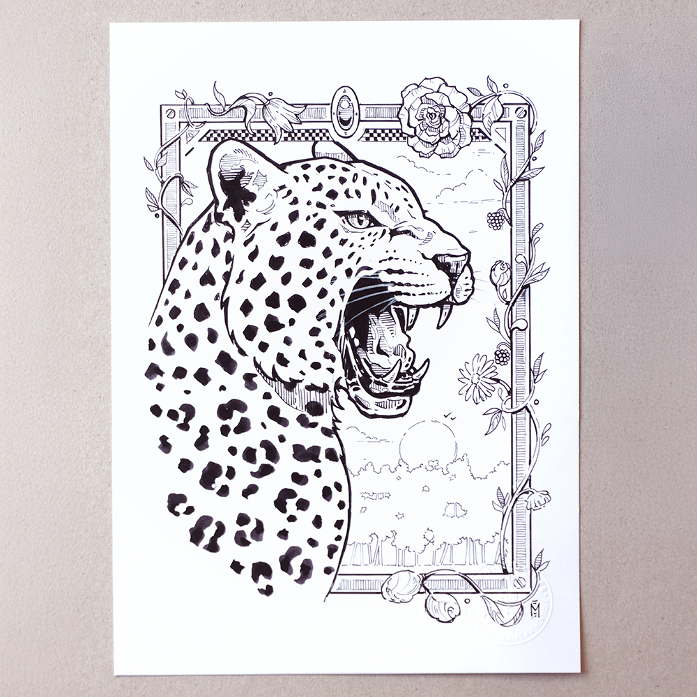 Son travail puise profondément dans la nature : animaux, végétaux, textures organiques et motifs inspirés du vivant nourrissent chacune de ses créations. Si elle explore de nombreuses techniques, du dessin traditionnel au digital, en passant par la peinture ou le tatouage, elle revient toujours à ce qui l’anime depuis l’enfance : le dessin à l’encre, en monochrome, un médium qui lui permet de jouer avec la lumière, les contrastes et la finesse du trait.
